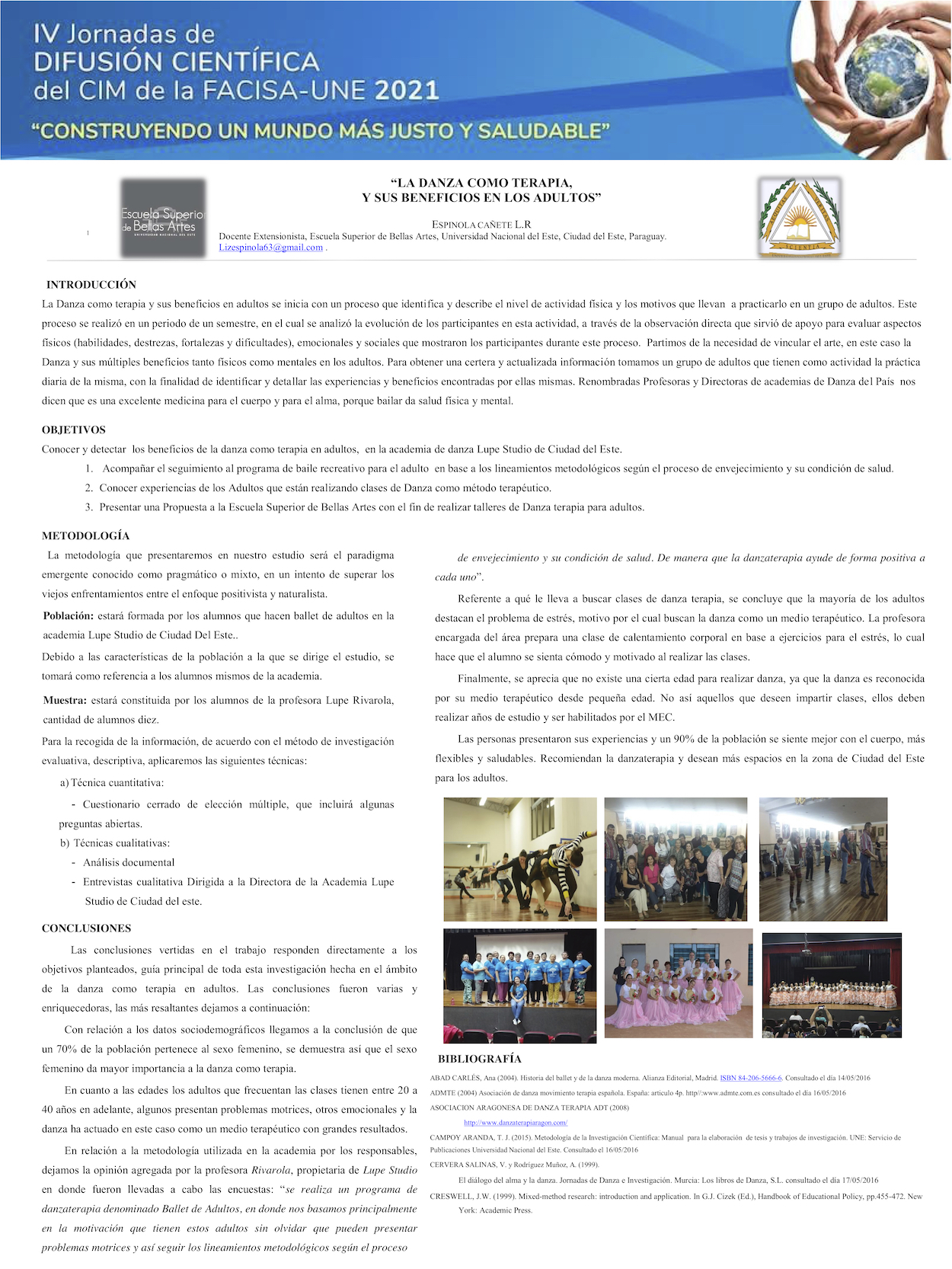 La Danza como terapia y sus beneficios en adultos se inicia con un proceso que identifica y describe el nivel de actividad física y los motivos que llevan a practicarlo en un grupo de adultos. Este proceso se realizó en un periodo de un semestre, en el cual se analizó la evolución de los participantes en esta actividad, a través de la observación directa que sirvió de apoyo para evaluar aspectos físicos (habilidades, destrezas, fortalezas y dificultades), emocionales y sociales que mostraron los participantes durante este proceso. Partimos de la necesidad de vincular el arte, en este caso la Danza y sus múltiples beneficios tanto físicos como mentales en los adultos. Para obtener una certera y actualizada información tomamos un grupo de adultos que tienen como actividad la práctica diaria de la misma, con la finalidad de identificar y detallar las experiencias y beneficios encontradas por ellas mismas. Renombradas Profesoras y Directoras de academias de Danza del País nos dicen que es una excelente medicina para el cuerpo y para el alma, porque bailar da salud física y mental.