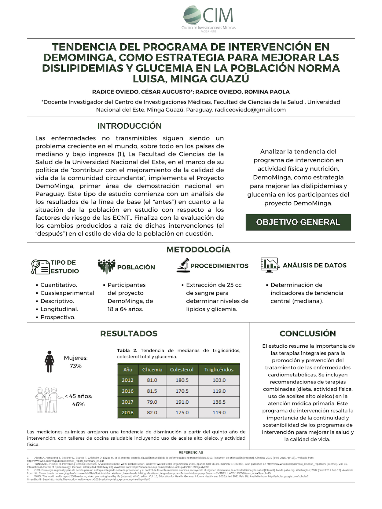 Las enfermedades no transmisibles siguen siendo un problema creciente en el mundo, sobre todo en los países de mediano y bajo ingresos, La Facultad de Ciencias de la Salud de la Universidad Nacional del Este, en el marco de su política de “contribuir con el mejoramiento de la calidad de vida de la comunidad circundante”, implementa el Proyecto DemoMinga, primer área de demostración nacional en Paraguay. Este tipo de estudio comienza con un análisis de los resultados de la línea de base (el “antes”) en cuanto a la situación de la población en estudio con respecto a los factores de riesgo de las ECNT,. Finaliza con la evaluación de los cambios producidos a raíz de dichas intervenciones (el “después”) en el estilo de vida de la población en cuestión.