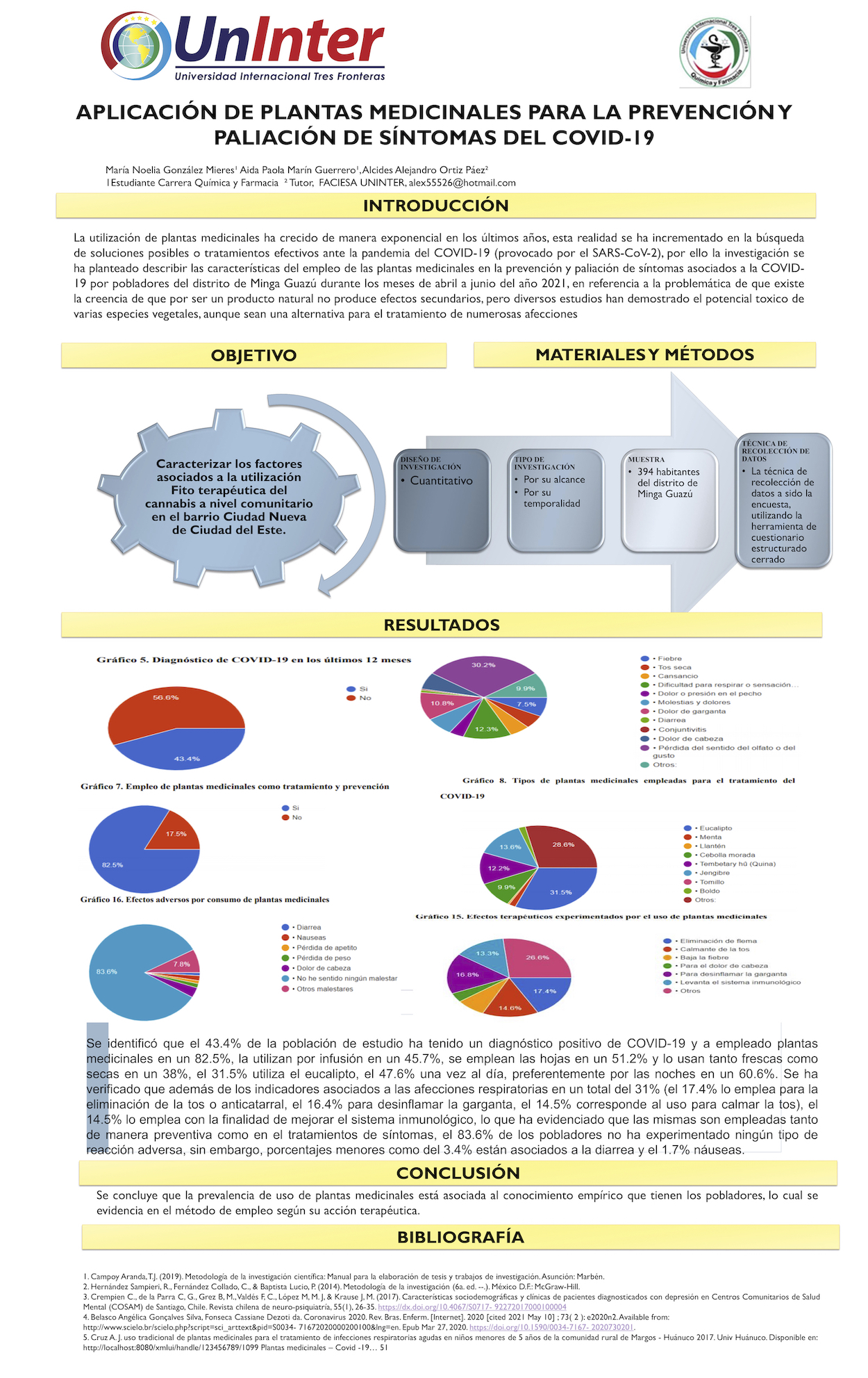 La utilización de plantas medicinales ha crecido de manera exponencial en los últimos años, esta realidad se ha incrementado en la búsqueda de soluciones posibles o tratamientos efectivos ante la pandemia del COVID-19 (provocado por el SARS-CoV-2), por ello la investigación se ha planteado describir las características del empleo de las plantas medicinales en la prevención y paliación de síntomas asociados a la COVID- 19 por pobladores del distrito de Minga Guazú durante los meses de abril a junio del año 2021, en referencia a la problemática de que existe la creencia de que por ser un producto natural no produce efectos secundarios, pero diversos estudios han demostrado el potencial toxico de varias especies vegetales, aunque sean una alternativa para el tratamiento de numerosas afecciones.